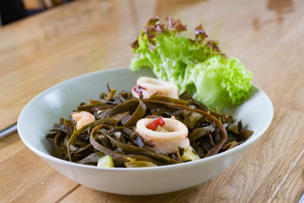 Sobald die Algennudeln fertig gegart sind, Wasser abschöpfen und die Algennudeln in die Pfanne geben. Noch mal kurz anbraten und servieren.