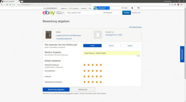 Ein paar Nachrichten hin und her, oh Wunder, ich kann keine Bewertung für diese Transaktion verfassen. Der Kauf ist vollständig von meinem eBay Profil verschwunden. Die PC-Maus habe ich nie bekommen.