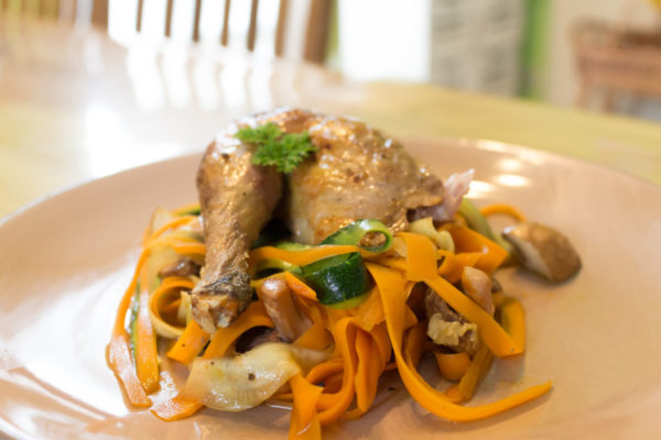 Letztens habe ich in der Tiefkühlabteilung einen Fasan entdeckt. Schöner wäre na klar vom Jäger direkt, aber hey wann kommt man sonst mal an so was ran? Ich dachte, daraus kann ich bestimmt, was Leckeres kochen. Heute gab es also gebackenen Fasan aus dem Ofen, dazu Zucchini- Möhrennudeln und Champignons.