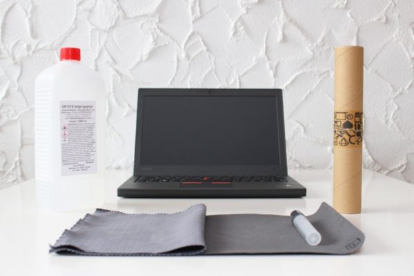 Zum Schluss entferne ich noch Fett, Schmutz und Fingerabdrücke von der Oberfläche des Notebooks mit Alkohol. Dazu habe ich mir mal so ein Notebook Reinigungsset von Octone besorgt. Da ist eine leere Sprühflasche, ein Mikrofasertuch und ein Display Schutztuch bei.