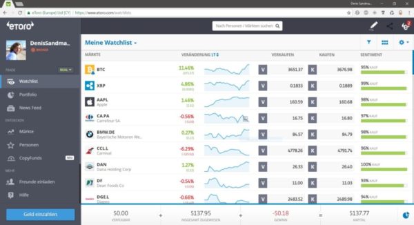 Schon vor einigen Jahren hab ich mich neben der Schule mit dem Handeln von Aktien, Devisen und Rohstoffen beschäftigt. Ich fand es interessant, dass es Leute gibt, die im Internet Objekte einkaufen, diese aber nie in der Hand halten oder einlagern. So richtig verstanden wie das funktioniert, hab ich bis heute nicht. Aber das Interesse ist geblieben. Besonders die Plattform eToro hat es mir angetan, denn dort ist das Traden ziemlich einfach und grafisch gut aufbereitet.