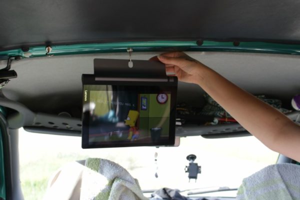 So hängen wir also das Tablet an die Decke des Fahrzeugs und können so alles mögliche schauen, wie bei einem Fernseher mit Wandhalterung.